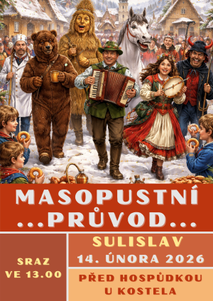 V Sulislavi proběhne 14. února 2026 masopustní průvod. Sraz účastníků je naplánován na 13.00 před hospůdkou u kostela.