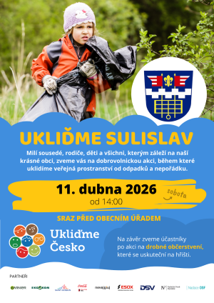 Zveme vás na dobrovolnickou akci s názvem Ukliďme Sulislav, která se koná dne 11. dubna 2026 od 14:00.
